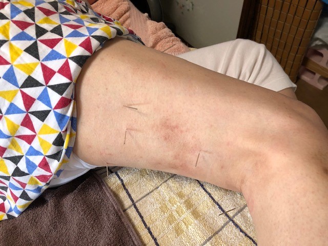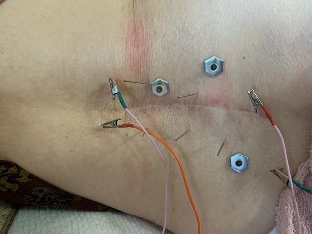 筋緊張の強い部位に刺鍼をして電子鍼を